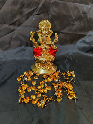 24kr gold coated Ganesh idol 6inch with German Silver washable 108 gold Mantra flowers full set ideal for Home Pooja decor