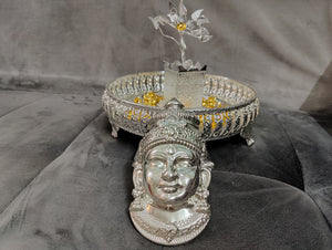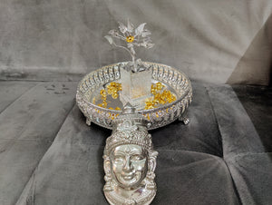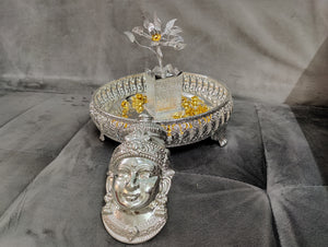Imported German silver tray with Tulsi 6" and 108 mantra stoned flowers+ Lakshmi face