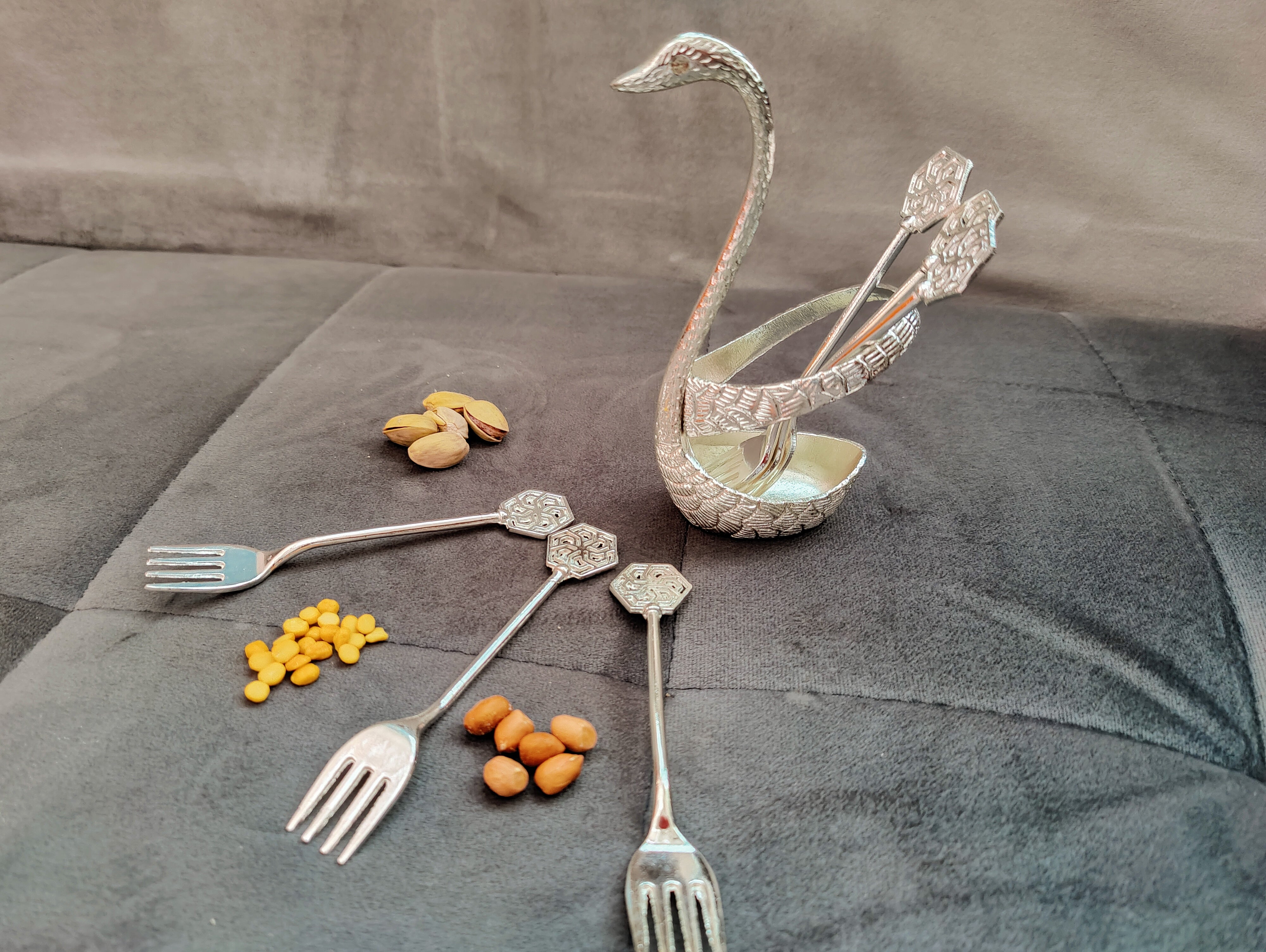 German silver washable swan fork set 5inch forks 6pcs with swan set washable with colgate powder only ideal for return gifts for any occasion Daily use possible