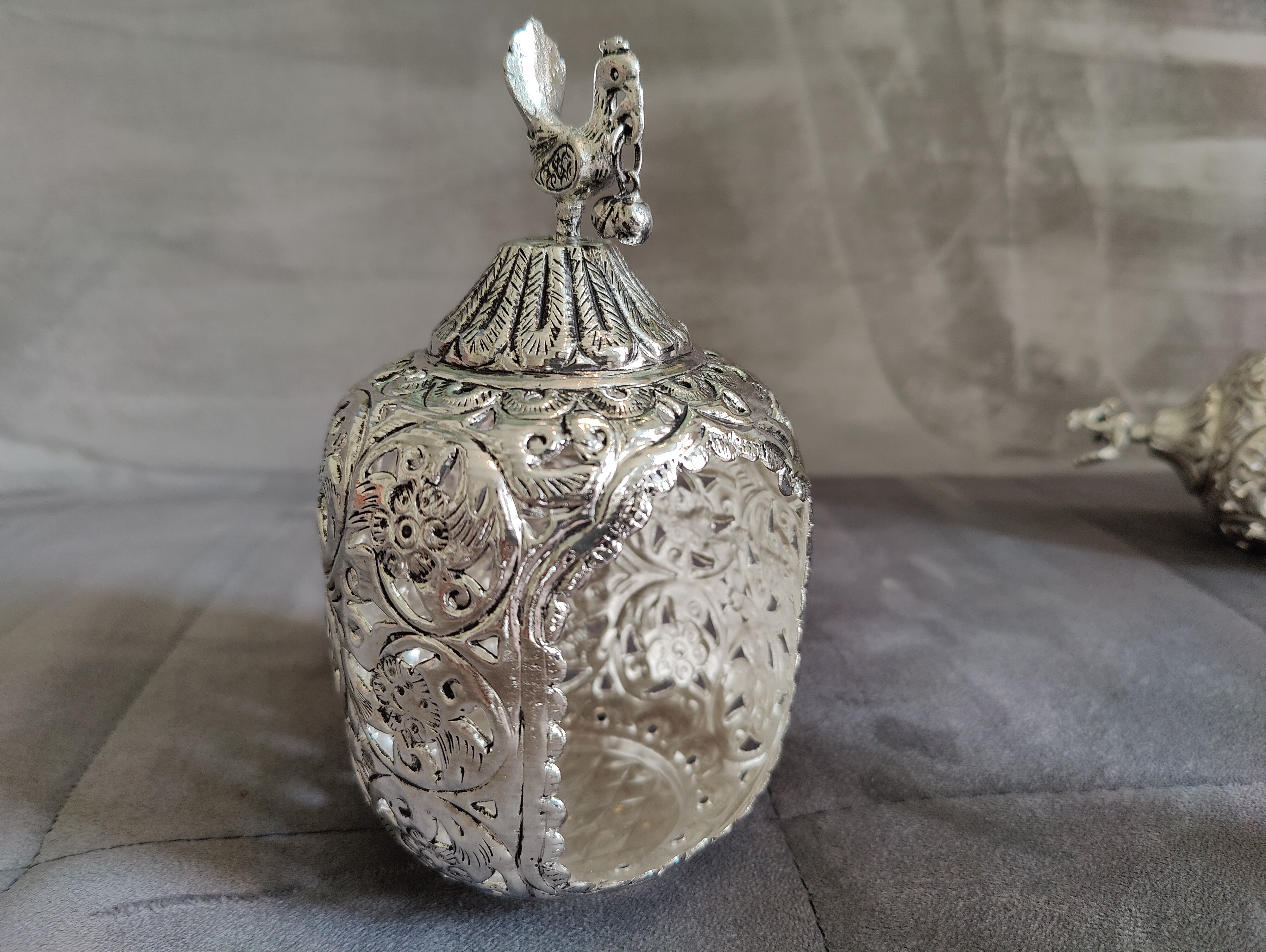 Antique German silver washable nakshi work Akhand tea light holder fancy design big size ideal for return gifts 6.5 Removable. Note (sgt antique German silver washable articles are pure silver polished) life time usable ideal for return gifts for any occasion. Daily use possible