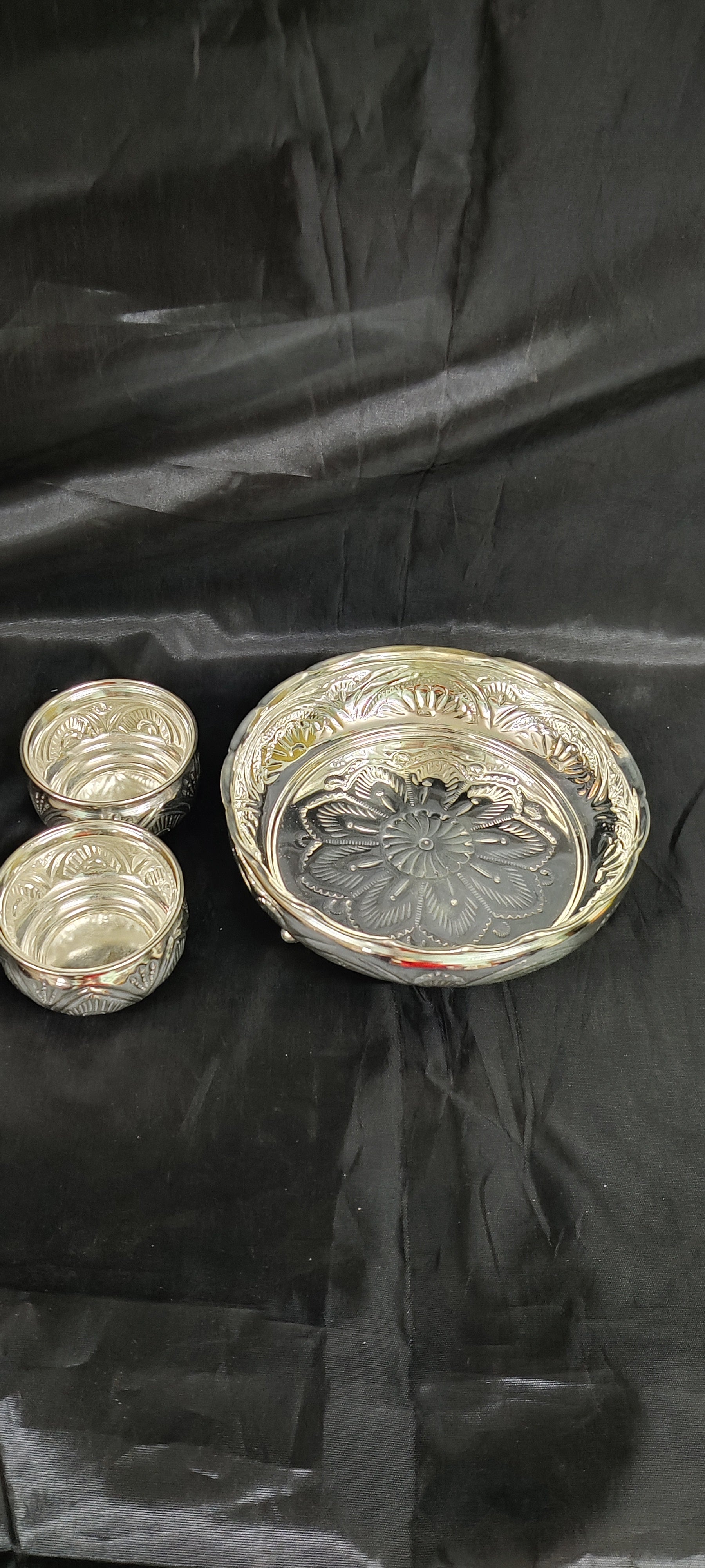 German silver washable pooja plate 8inch with German silver washable 3inch bowls