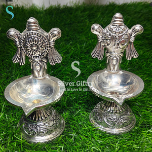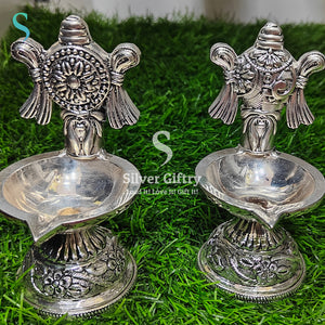Antique German silver washable shanku and chakra diya pair pure silver coated premium quality life 15 years, 5 inch each life time usable ideal for home pooja decor. Daily use possible