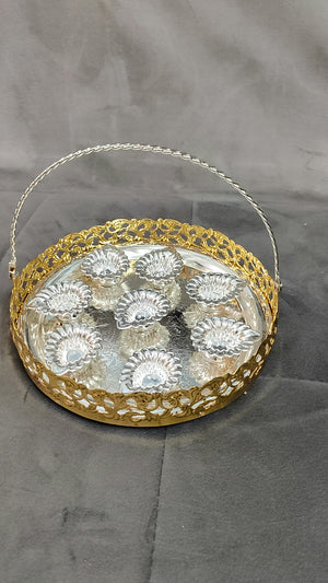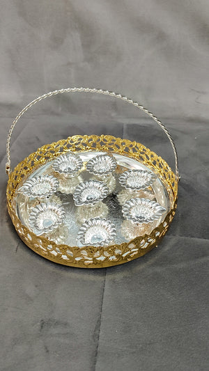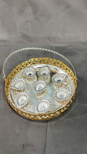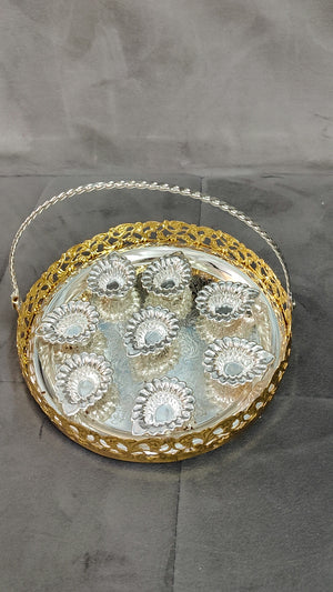 Imported German silver washable tray 9inch with handle + German silver deepam 2" with stand (8 pcs) ideal for return gifts for any occasion Daily use possible Washable with water